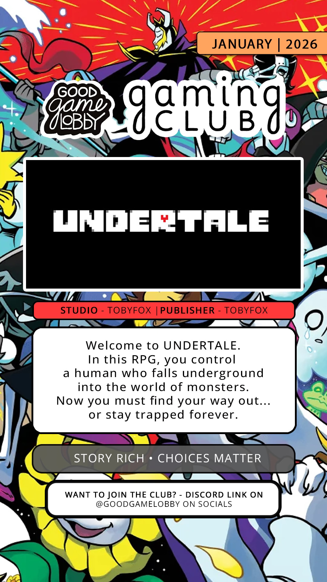 As part of Good Game Lobby Monthly Gaming Club we were playing Undertale. A cult classic it seems. I must admit it wasn't what I expected. :D In some areas in a good way in others not so much. I understand why it has amassed a cult following, the writing and characters are quirky and memorable, it tires to subvert the RPG genre and has a wholesome message. It just wasn’t really for me to place it in my favourite games. But I am glad I have experienced it.